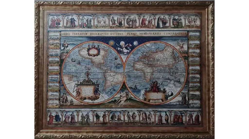 O centro do singelo ensaio sobre a Cartografia na História, a caracterização geopolítica e a cultura dos povos do mundo, em meados do século XVIII, é o Mapa da autoria do cartógrafo e editor holandês Henricus Hondius (1597-1651).